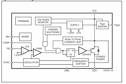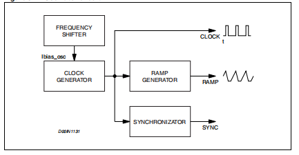 图5显示了振荡器电路的框图。时钟发生器提供内部固定在500千赫。移频器块在强的情况下起到降低开关频率的作用过电流或短路。时钟信号随后用于内部逻辑电路斜坡发生器和同步块的输入。斜坡发生器电路提供锯齿波信号,用于实现PWM控制内部电压前馈,同步电路产生同步信号。事实上,该设备有一个同步管脚,可以同时。作为主机同步外部设备的内部开关频率。作为从机通过外部信号同步。