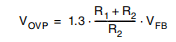 过电压保护,OVP,是通过一个内部比较器来实现的,它的输入是连接到反馈,当OVP阈值为达到。该阈值通常比反馈电压高30%。当要求分压器调节输出电压时(参见测试应用电路),OVP干预将设置为: