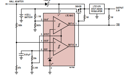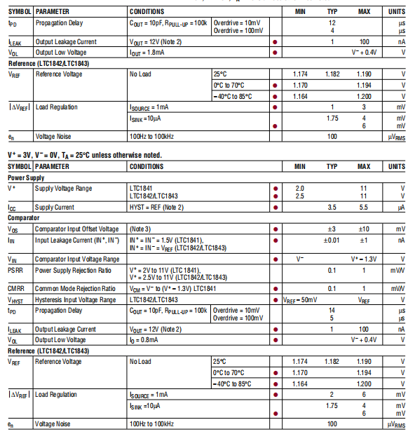比较器的工作电压为2V至11V(2.5V至LTC1842/LTC1843为11V)或双路±1V至±5.5V电源(LTC1842/LTC1843为±1.25V至±5.5V)。如果参考电源大于1mA或电源需要输出源阻抗高,V+应通过0.1μF电容器。