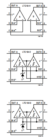 LTC®1841/LTC1842/LTC1843为超低功耗双通道带内置基准的比较器(LTC1842/LTC1843)。比较器的供电电流小于5.7μA超温,1.182V±1%参考电压,可编程迟滞和漏极开路输出,降低电流。参考输出可以驱动高达0.01μF,无振荡。LTC1841从一个2V到11V电源或双路±1V至±5.5V电源。LTC1842/LTC1843型从单个2.5V至11V电源或双电源±1.25V工作至±5.5V电源。LTC1842/LTC1843磁滞使用两个电阻和HYST很容易编程别针。比较器的输入从负极开始工作在正电源的1.3V范围内供电。比较器的输出级通常会下沉超过20mA。通过消除正常情况下的交叉传导电流当比较器改变逻辑状态时发生消除了供应故障。LTC1841/LTC1842/LTC1843在SO-8中提供包装。