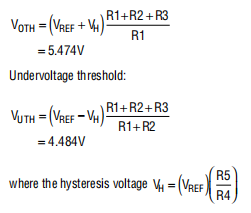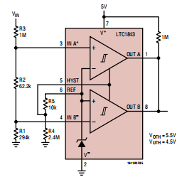 LTC1843是微功率窗口的理想选择探测器如图5所示。R1、R2和R3的值为4.5V欠压阈值和5.5V选择过电压阈值。R4和R5设置滞后电压。以下设计程序可用于选择组件值: