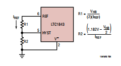 LTC1842/LTC1843可通过以下方式增加磁滞在REF和HYST引脚之间连接电阻器(R1)以及从HYST到V的第二个电阻器(R2)(图4)。上下阈值之间的差异电压或滞后电压带(VHB)等于两倍REF和HYST引脚之间的电压差。随着磁滞效应的增加,上阈值的增加量与低阈值的减小量相同。REF和HYST之间允许的最大电压引脚为50mV,产生最大滞后电压100毫伏波段。磁滞带的变化范围可达15%。如果不需要滞后,则HYST引脚应对参考短路。IREF范围的可接受值为0.1μA至5μA。如果R2选择2.4M,则R1等于VHB值。