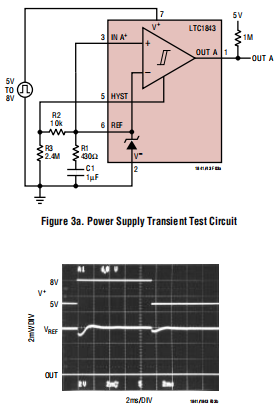 图3显示了带有应用于V+引脚的方波。电阻R2和R3组当R1阻尼参考响应。注意比较器输出不会绊倒的。