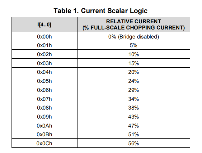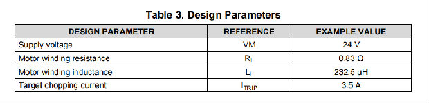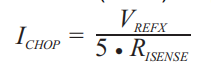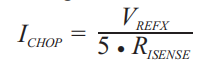 例子:如果使用0.25-Ω感测电阻器且VREFx引脚为2.5 V,则满标度(100%)斩波电流将为2.5 V/(5×0.25Ω)=2 a。