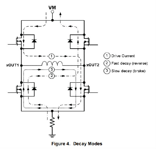 一旦达到斩波电流阈值,H桥可以在两种不同的状态下工作,快衰减或慢衰减。