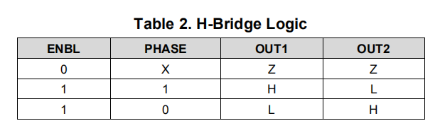 相位输入引脚控制流过H桥的电流方向。ENBL输入引脚在激活高电平时启用H桥输出。表2显示了逻辑。