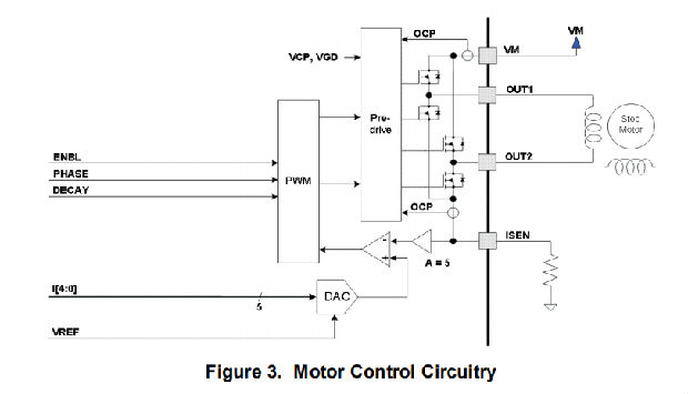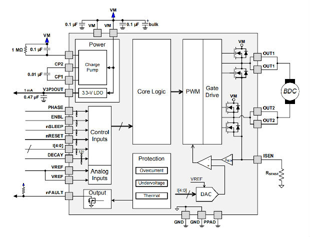 PH/EN引脚提供了一个简单的控制接口。一个内部感应放大器允许可调电流控制。使用专用的nSLEEP引脚为非常低的静态电流待机提供了低功耗休眠模式。电流调节衰减模式可设置为慢衰减、快衰减或混合衰减。