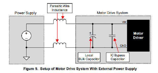 电源和电机驱动系统之间的电感会限制电源电流的变化率。如果局部大容量电容太小,系统将对过大的电流需求作出响应,或者随着电压的变化而从电机中卸载。当使用足够的大容量电容时,电机电压保持稳定,并能快速提供大电流。