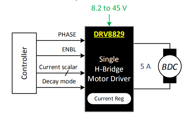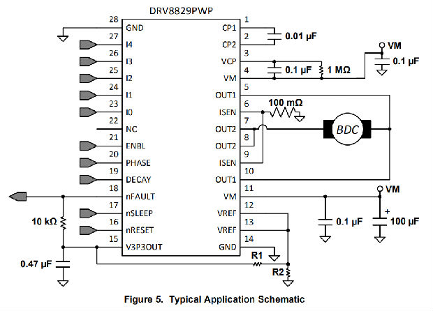 在此应用中,DRV8829将用于驱动有刷直流电机。以下设计过程可用于配置DRV8829。