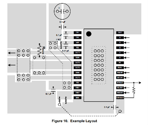 电源板™ 包装使用一个暴露的垫子来去除设备的热量。为了正确操作,该焊盘必须与PCB上的铜热连接以散热。在具有接地板的多层PCB上,这可以通过添加多个通孔来实现,以将热垫连接到地平面。在没有内部平面的PCB上,可以在PCB的任一侧添加铜区域来散热。如果铜区在PCB的另一侧,热通孔用于在顶层和底层之间传递热量。