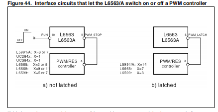 第三条通信线路是PWM_STOP引脚(引脚9),它与定位销(销10)。PWM U STOP引脚的作用是抑制PFC级和级联DC-DC变换器。引脚是开路集电极,常开,如果设备被低于0.52V的电压禁用运行pin。必须指出,此功能在PFC级是主级,级联DC-DC变换器是从级,换句话说,当PFC阶段首先开始时,为两个控制器供电并启用/禁用操作DC-DC级的。这个功能非常灵活,可以用不同的方式使用。在包含辅助转换器和主转换器(例如台式电脑的银盒或高端液晶电视),当辅助变流器也为主变流器的控制器供电时,引脚运行可用于启动和停止主变流器。在最简单的情况下,启用/禁用脉宽调制控制器脉宽调制停止引脚可以连接到任何一个错误的输出放大器(图44a)或,如果芯片配备了它,到它的软启动引脚(图44b)。这个软启动引脚的使用允许设计者延迟DC-DC阶段的启动关于PFC阶段,这是经常需要的。基本假设要使其正常工作,PWM控制器的UVLO阈值是肯定的比L6563/A高。