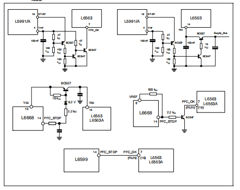 该集成电路的一个特点是便于“内务管理”的实施协调PFC级与级联DC DC变换器工作所需的电路。内务管理电路实现的功能确保瞬态如通电或断电顺序或任何一个功率级的故障处理得当。这个设备提供了一些插针来实现这一点。如前所述,一条通信线路级联型DC-DC变换器的集成电路和PWM控制器之间是脉冲宽度调制锁闩销,当功率因数校正正常工作时,它常开,如果工作正常则变高失去对输出电压的控制(由于控制回路故障)或电感饱和,目的是锁定级联DC-DC的PWM控制器转换器(第6.2节:反馈故障保护(FFP)第18页了解更多细节)。第二通信线路可以通过包含在PFC_OK引脚(更多详细信息,请参阅第18页第6.2节)。通常这条线用于允许级联型DC-DC变换器的PWM控制器轻载,尽量减少空载输入消耗。如果剩余消耗芯片出了问题,也有可能降低电源电压。接口电路如如图43所示,其中L6563/A与L5991 PWM控制器一起工作具有待机功能,可使用。不用说,此操作假定级联DC-DC变换器级作为主级,PFC级作为从级或换句话说,DC-DC阶段首先启动,它为控制器和启用/禁用PFC阶段的操作。