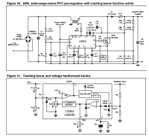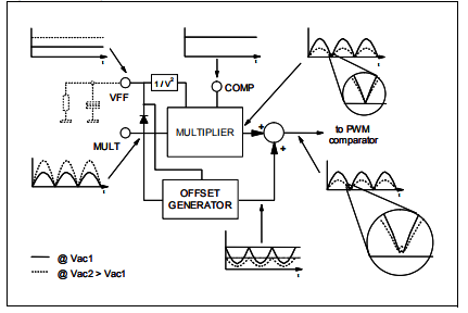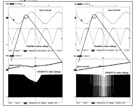 本质上,电路人为地增加了电源开关的接通时间在线路电压过零点附近加到乘法器输出端的偏移量。当瞬时线路电压增加时,偏移量减小,因此当线电压向正弦曲线顶部移动时,可以忽略不计。此外,偏移量为由VFF引脚上的电压调制(见第18页第6.3节),以便在低线处的偏移量很小,在这里零交叉处的能量传递通常是相当好的,并且在能量传输变差的高压线上偏移量越大。电路的效果如图38所示,其中标准TM的关键波形将PFC控制器与该芯片进行了比较。为了最大限度地利用THD优化电路,高频滤波电容器整流桥后应尽量减少,兼容EMI滤波的需要。一个大的实际上,电容本身就引入了交流输入电流的传导死角-即使通过PFC预调节器实现了理想的能量转移,也降低了效率优化器电路。