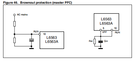另一种可能的使用运行和脉宽调制停止引脚(同样,在系统中,PFC阶段是主人)是失火保护,感谢滞后提供。断电保护基本上是一个非闭锁装置关闭功能,必须当检测到电源电压过低时激活。这种情况可能导致由于有效值电流过大,一次电源部分过热。棕色罐头也会导致PFC预调节器开环工作,这可能会对PFC造成危险如果输入电压突然恢复到额定值。另一个问题是在转换器供电过程中可能发生的虚假重启这使得转换器的输出电压不会单调地衰减到零。出于这些原因,通常最好在停电时关闭机组。