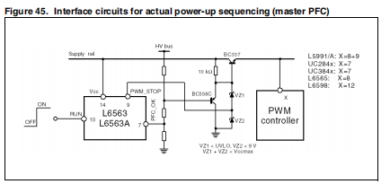 如果不是这样,或者不可能实现足够长的启动延迟(因为这会阻止DC-DC级正确启动),或者简单地说,PWM控制器由于没有软启动,图45的布置让DC-DC变换器启动时PFC级产生的电压达到预设值。技术依赖于PWM控制器的UVLO阈值。