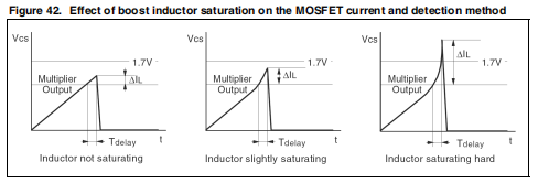 升压电感器的硬饱和可能是PFC预调节器的致命事件:电流上坡变得非常大(50-100倍陡峭,见图42),在洋流期间感应传播延迟电流可能达到异常高的值。电压降由感应电阻上的异常电流引起的栅源电压降低,所以MOSFET可以工作在有源区,消耗大量的功率,这会导致在几个切换周期后发生灾难性的故障。然而,在某些应用中,如ac-dc适配器,PFC预调节器为了节省能源,即使是一个设计良好的升压电感器也可以在轻负载下关闭当PFC级因较大负载而重新启动时,偶尔会出现轻微饱和需求。当重新启动发生在不利的线路电压相位时,会发生这种情况,因此输出电压可能显著低于整流峰值电压。因此,在升压电感器来自桥式整流器的浪涌电流加在开关上电流,而且,几乎没有或没有用于消磁的电压。为了处理饱和电感器,L6563在电流检测引脚(CS,引脚4),如果电压正常受限,则停止并锁定IC在1.1V内,超过1.7V。也可以通过断言为高电平的PWM U闩锁引脚。这样整个系统就会停止并启用只有在回收输入电源后才能重新启动,即当L6563的Vcc电压PWM控制器会低于各自的UVLO阈值。系统安全显著增加。以更好地适应在一定程度上饱和的升压电感器需要的应用可容忍的是,L6563A不支持此保护功能。