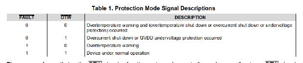 任何导致设备关闭的故障,如过热关机、过电流关机或欠压保护,都会由故障引脚变低发出信号。同样,当器件结温超过125°C时,OTW变低(见表1)。