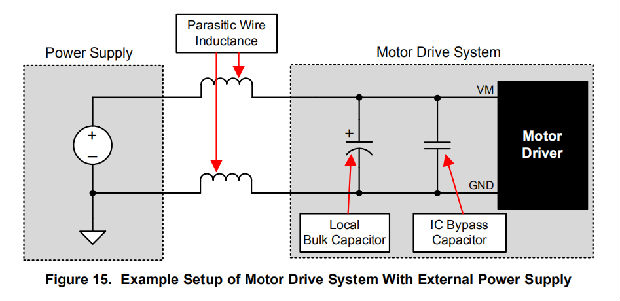 电源和电机驱动系统之间的电感会限制电源电流的变化率。如果局部大容量电容太小,系统将对过大的电流需求作出响应,或者随着电压的变化而从电机中卸载。当使用足够的大容量电容时,电机电压保持稳定,并能快速提供大电流。