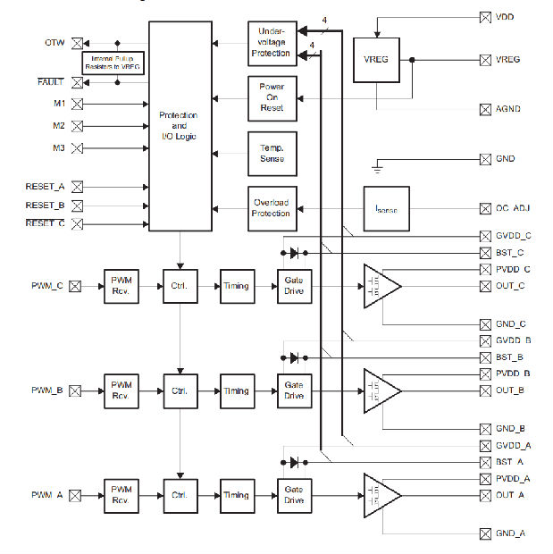 故障和OTW引脚均为低电平开路漏极输出。它们的功能是向PWM控制器或其他系统控制设备发送保护模式信号。