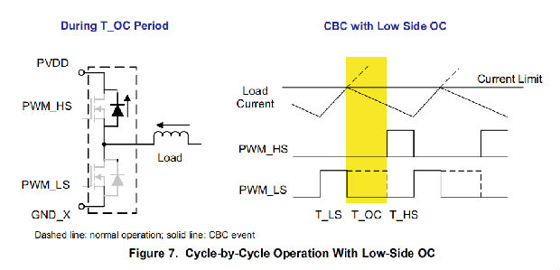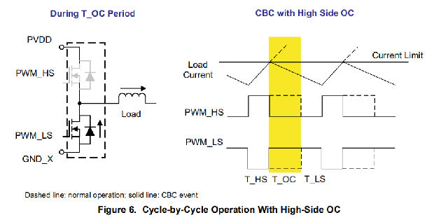 图6说明了高侧OC事件下的循环运行,图7显示了低侧OC的循环运行。虚线为未触发CBC事件时的操作波形,实线为触发CBC事件时的波形。在CBC限流模式下,当检测到低侧FET OC时,设备将关闭受影响的低侧FET,并将高侧FET保持在同一半桥上,直到下一个PWM周期;当检测到高侧FET OC时,设备将关闭受影响的高侧FET,并在半桥上打开低侧FET,直到下一个PWM周期。