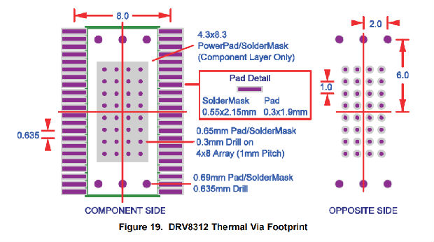 DRV8312的热垫安装在器件的底部,以提高器件的热性能。为了提供数据表中规定的功率,热焊盘必须焊接在PCB上,覆盖范围非常好。下图显示了DRV8312建议的热通孔和焊环图案设计。有关更多信息,请参阅TI应用报告、PowerPad Make Easy(SLMA004)和PowerPad布局指南(SLOA120)。