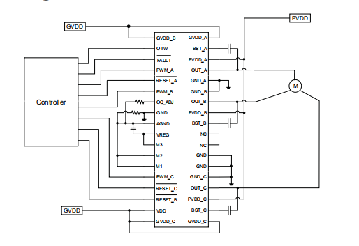 VDD管脚的瞬态电流明显高于通过VDD管脚的平均电流。应使用低电阻路径至GVDD。22-μF至47-μF电容器应放置在100 nF至1-μF去耦电容器旁边的VDD引脚上,以在瞬态期间提供恒定电压。