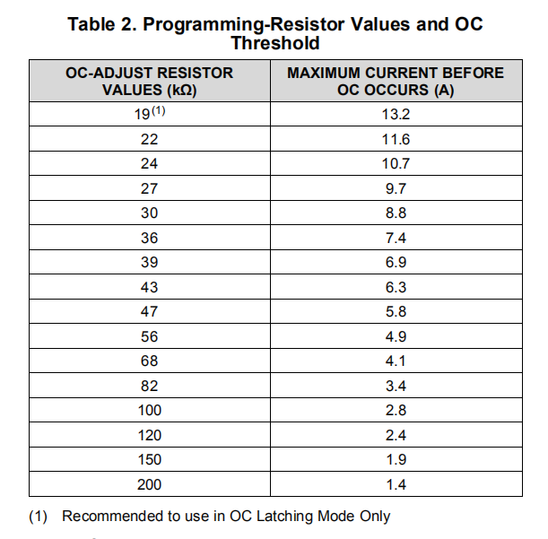 表2中的值显示了给定电阻器的典型OC阈值。假设多个器件的OC_ADJ引脚上的电阻是固定的,则OC阈值测量中的器件间变化可能为20%。因此,此功能设计用于系统保护,而不是用于精确电流控制。
