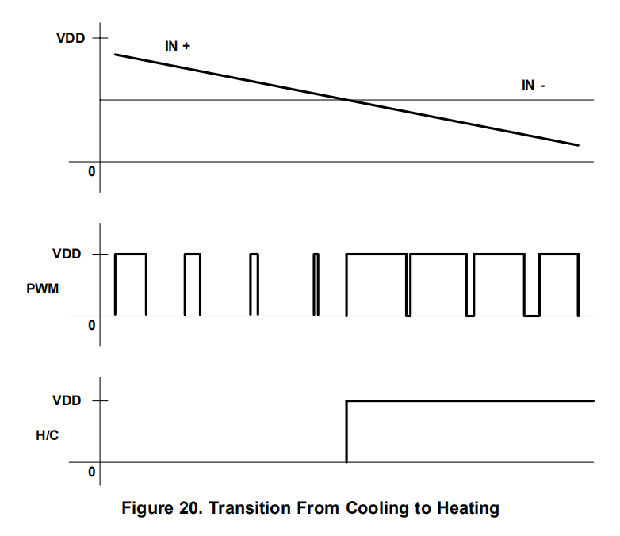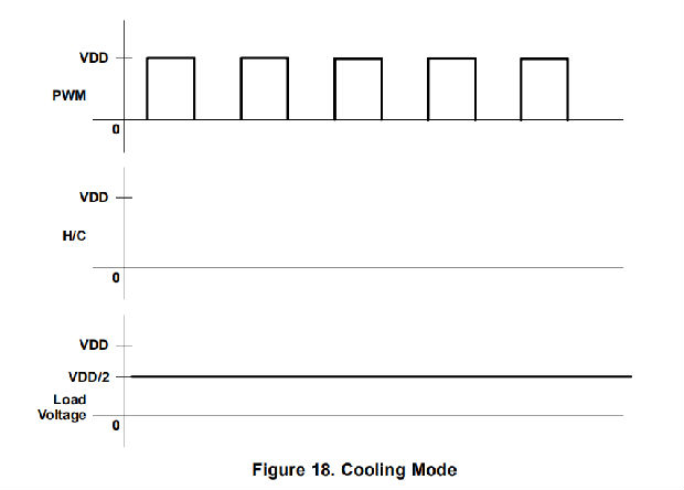 当设备从冷却过渡到加热时,PWM输出的占空比减小到一个小值,H/C输出保持在地上。当设备转换到加热模式时,H/C输出从零伏变为VDD,PWM输出变为高占空比。电流的方向是相反的,但是在负载上保持低电压。当部件进一步进入加热模式以驱动更多电流通过负载时,占空比降低。图20说明了从冷却到加热的过渡。