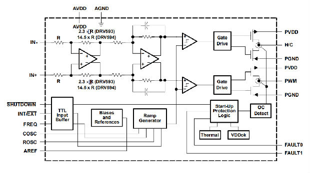 DRV593和DRV594内部有热过载和电流过载保护。逻辑电平故障指示灯在结温达到约115°C时发出信号,以便在放大器的内部热关机电路启动之前进行系统级关机。当发生过电流事件时,故障指示灯也会发出信号。如果过电流电路跳闸,装置自动复位(更多详情见应用信息部分)。