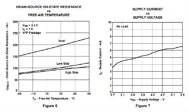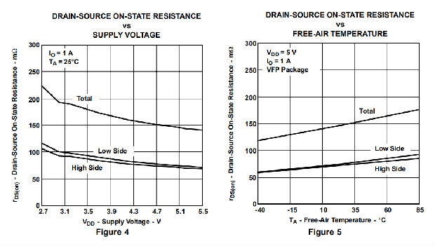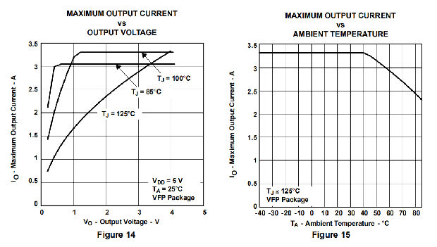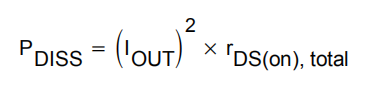 例如,在总导通电阻为130 mΩ(TJ=25°C时)的最大输出电流为3 A,封装中消耗的功率为1.17 W。