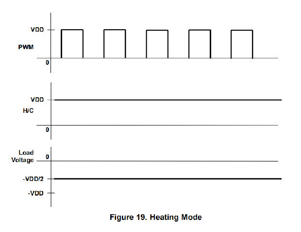 图19显示了DRV593和DRV594处于加热模式。H/C输出在VDD,PWM输出与负载上的电压成比例。