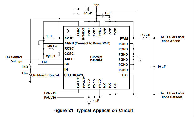 图18显示了处于冷却模式的DRV593和DRV594。H/C输出(引脚14-17)接地,PWM输出(引脚24-27)在负载上产生与输入电压成比例的电压。