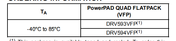 (1)、这个包裹可以用胶带卷起来。要订购此包装选项,请在零件号上添加一个R后缀(例如,DRV593VFPR或DRV594VFPR)。