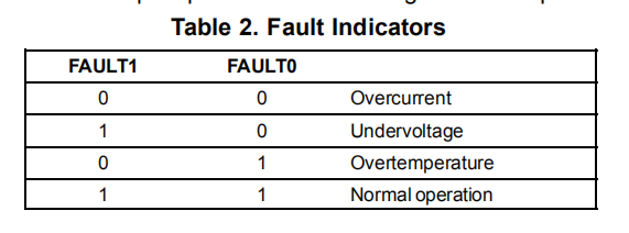这三种故障条件通过FAULT1和FAULT0端子进行解码。在内部,这些是开漏输出,因此需要一个5 kΩ或更大的外部上拉电阻。