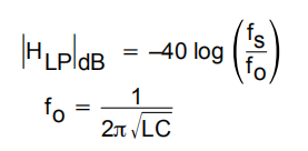 对于DRV593和DRV594,差分输出开关频率通常选择为500 kHz。滤波器的谐振频率通常选择为比开关频率低至少一个数量级。然后,可将方程(5)简化为给出以下震级方程(6)。这些方程假设使用图22中的过滤器。