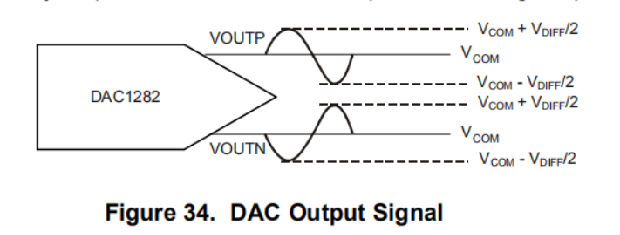 如图34所示,DAC在引脚VOUTP和VOUTN上提供差分电压(VDIFF=VOUTP–VOUTN)。输出共模电压(VCOM)调节到低于模拟电源(AVDD–AVSS)中点100 mV。
