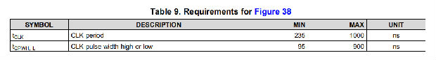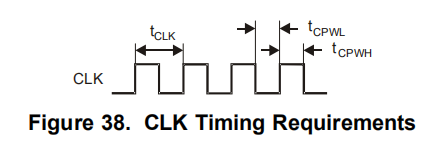 CLK引脚是DAC1282的主时钟输入,通常为4.096 MHz。作为一个高性能的时钟源,高性能是必不可少的。建议使用晶体振荡器或低抖动锁相环时钟源。确保通过保持跟踪较短和源端接(通常为50Ω)来避免在输入端振铃。参见图38和表9所示的CLK规范。