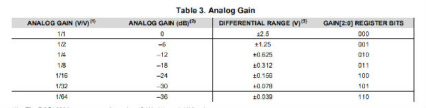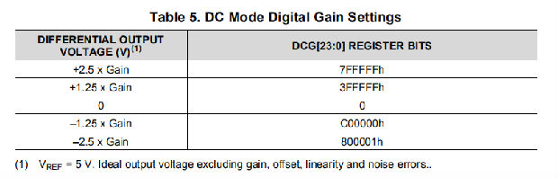 增益[2:0]寄存器位设置模拟增益(见表3)。DCG[23:0]寄存器位设置所选模拟范围内的24位电平。表5列出了直流模式下的数字增益设置。