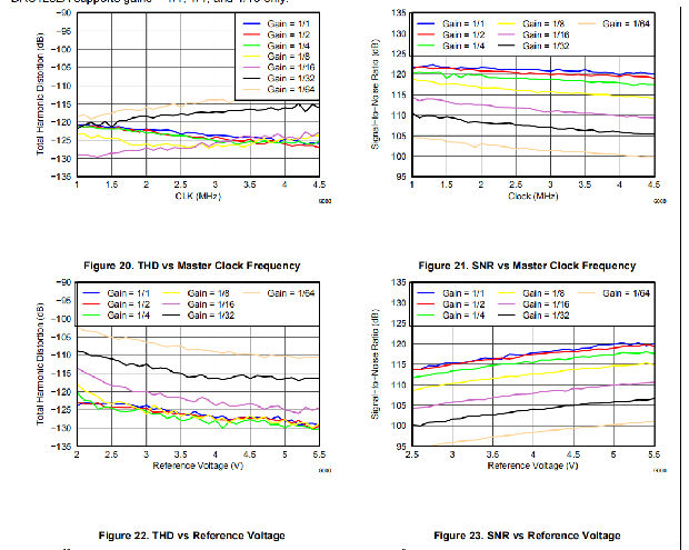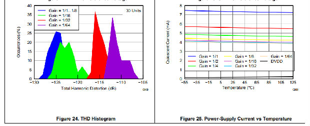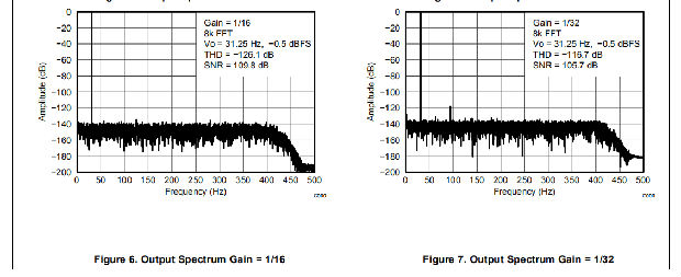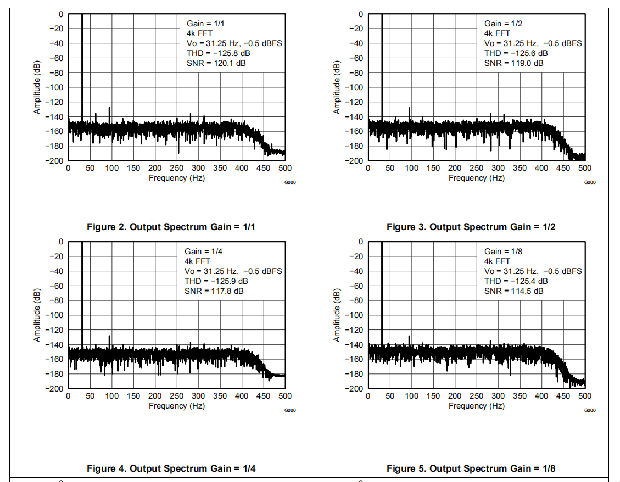 THD用–0.5-dBFS输出信号电平和31.25-Hz测试频率测量,然后对4096点ADC采集记录进行FFT。ADC数据点增加到16384,增益为1/16、1/32和1/64,以改善由于更高的噪声地板而产生的谐波再现。THD测量值代表ADS1282 THD和DAC1282 THD的组合。