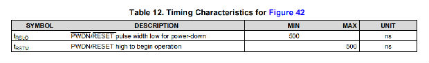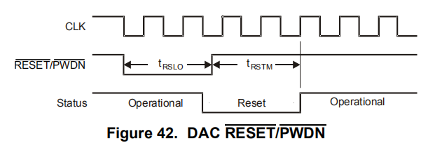 DAC1282通过使reset/PWDN引脚处于低位至少两个fCLK周期来复位,然后再回到高电平。DAC1282保持重置2个fCLK周期;在此时间之后,DAC通信可能开始,如图42和表12所示。