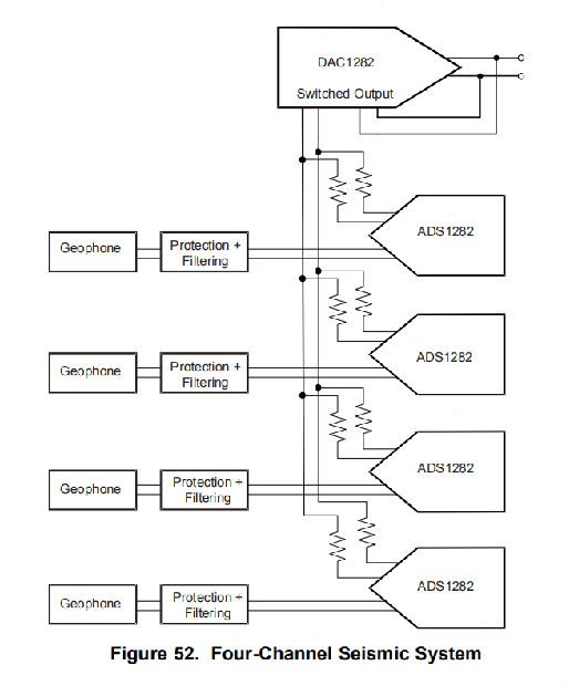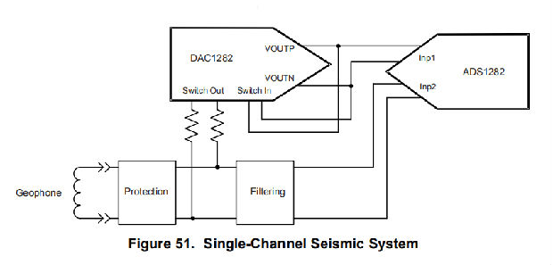 图51说明了地震的单通道数据采集概念。DAC1282用于测试ADC和检波器。DAC1282直接连接到ADC的信道1。ADC的测试包括THD、脉冲、输入噪声、共模等。DAC输出和ADC采样定时由同步输入管脚控制。
