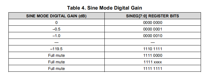 数字增益分辨率以0.5分贝为增量,从0分贝到全静音,并由正弦[7:0]寄存器位编程。表4列出了数字增益设置。方程式2是正弦模式下的振幅设置。
