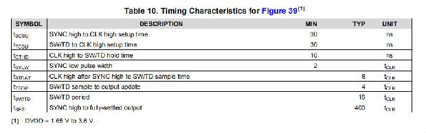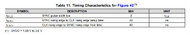 要同步DAC,请遵守图40所示的CLK定时要求。也就是说,同步上升沿应在设置时间之前或保持时间规范之后应用。如果不满足同步定时要求,则DAC可能与一个时钟周期定时误差同步。