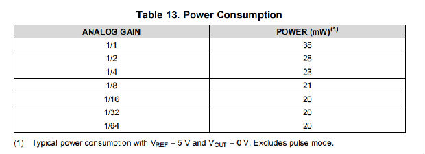 DAC1282消耗的功率取决于模拟增益。表13显示了DAC功耗。