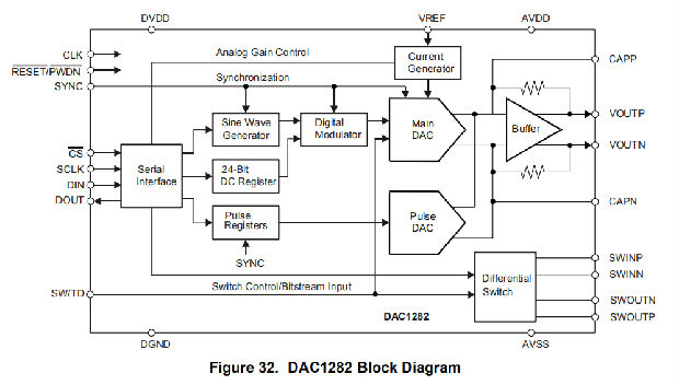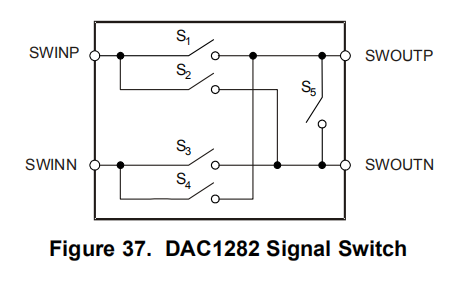 DAC1282包括一个低失真差分输出开关。输出开关可以将DAC1282输出连接到用于THD和脉冲测试的传感器。开关由引脚或命令控制,因此允许精确的开关定时。