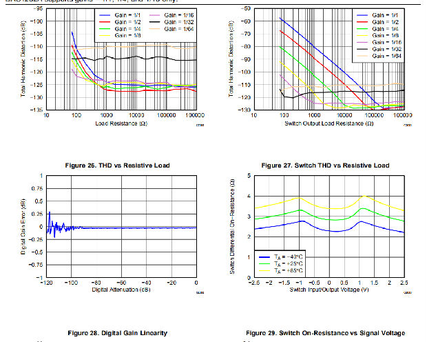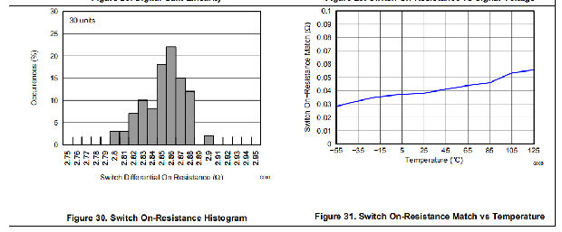 如图29所示,接通电阻随开关信号电平的变化而变化。当开关被用来发送信号,并且一个电阻负载连接到开关输出时,开关接通电阻的变化与负载电阻相互作用,导致THD降低。图27说明了THD与开关负载电阻的关系。THD数据的相关性是用一个满标度信号来获得的。