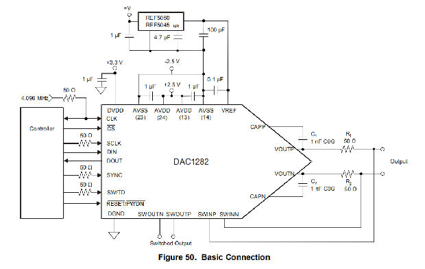图50显示了基本的DAC1282连接。所示为双极模拟电源(±2.5 V)。在AVDD=5 V和AVSS=GND的情况下,也可以进行单电源操作。数字电源范围为1.65伏至3.6伏。为了获得最佳性能,建议使用低噪声、低漂移基准,如REF5050(+5 V)和参考5045(+4.5伏)。虽然参考电压为4.5伏,但5伏参考电压可获得最佳信噪比(REF5045)可用于信噪比为1-dB的损耗。4.5伏参考电压可由5伏电源供电。AVSS(引脚14)是关键参考接地点,应使用星形连接连接连接至参考接地端子。C1和C2是所需的1-nF输出滤波器电容器。电容器应为低电压系数型(如COG陶瓷或类似产品),并放置在靠近器件引脚的位置。输出电阻R1和R2使DAC解耦,以确保驱动电容性负载时的最佳性能。输出显示为路由到信号开关,提供第二个开关式DAC输出。
