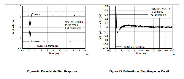 图44显示了同步管脚转换后的脉冲模式阶跃响应。图45显示了同步管脚转换后,脉冲模式细节设置为最终值的0.1%。