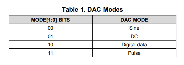 DAC1282有四种工作模式:正弦、直流、脉冲和外部数字数据输入。这些模式由GANMOD寄存器中的MODE[1:0]位进行编程,如表1所示。