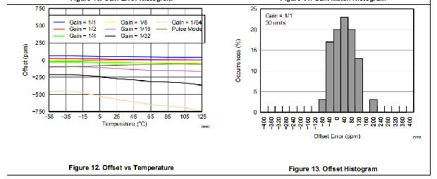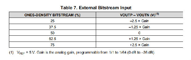 其中:VREF标称为5 V,增益是模拟增益(1/1到1/64),TD是比特流密度,从25%到75%。